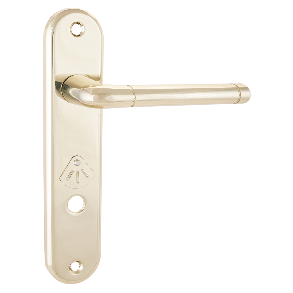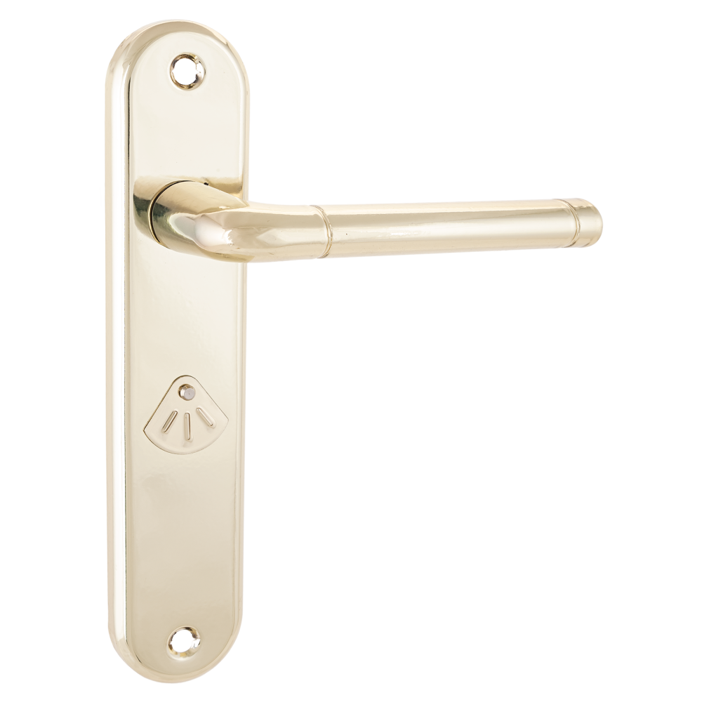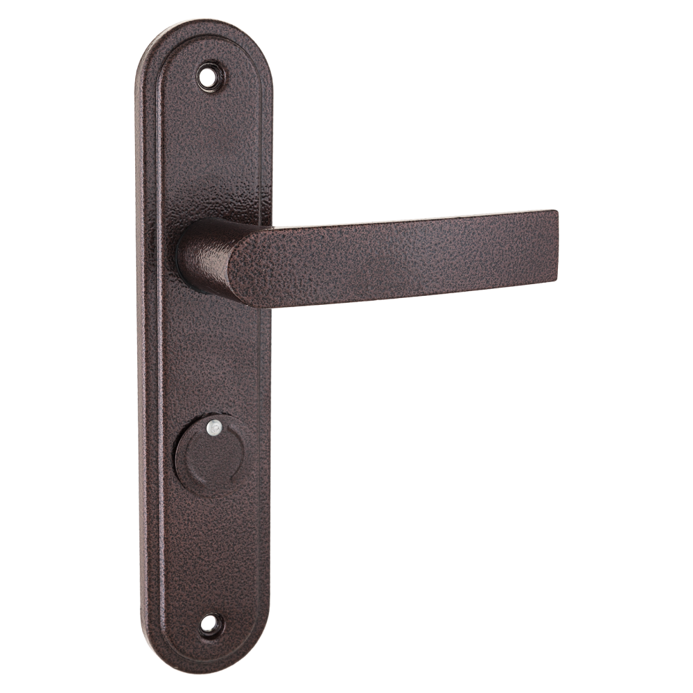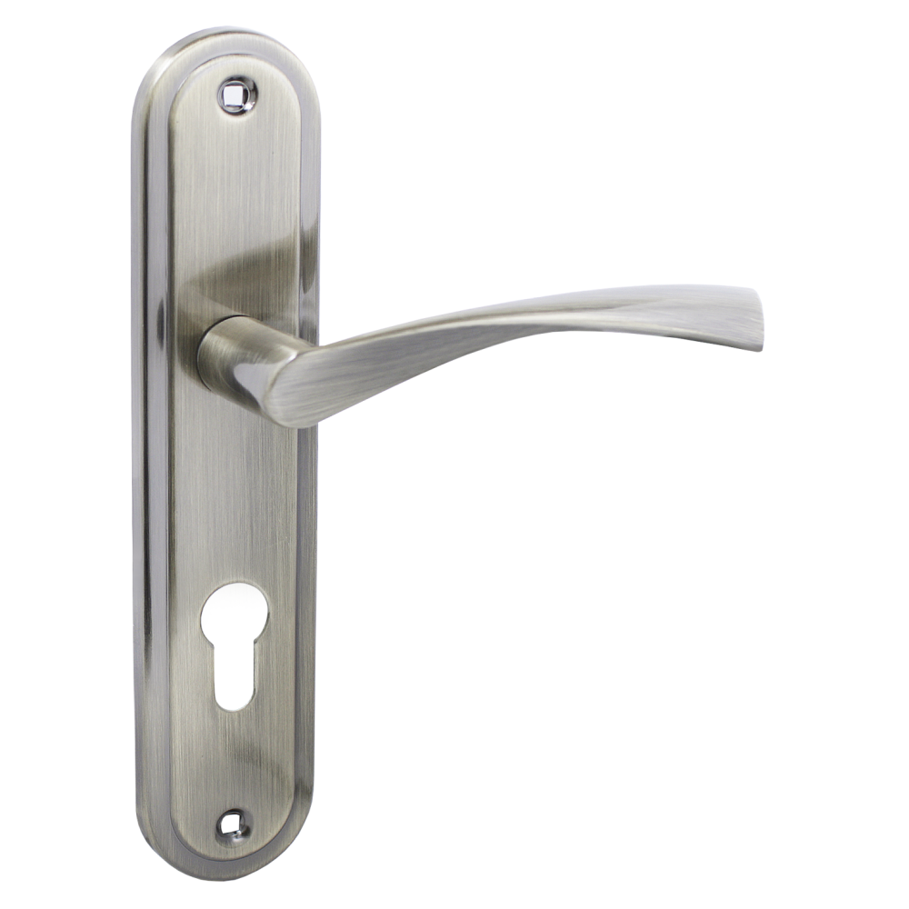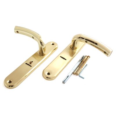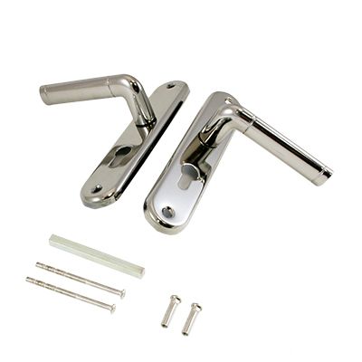 Фурнитуру собирают в виде накладки с отверстием под замок (или с запорной вертушкой) и ручкой. В отличие от варианта на розетке, состоящего из двух отдельных частей, здесь все элементы собраны в сплошной нажимной гарнитур — это второе название для ручек–планок.
